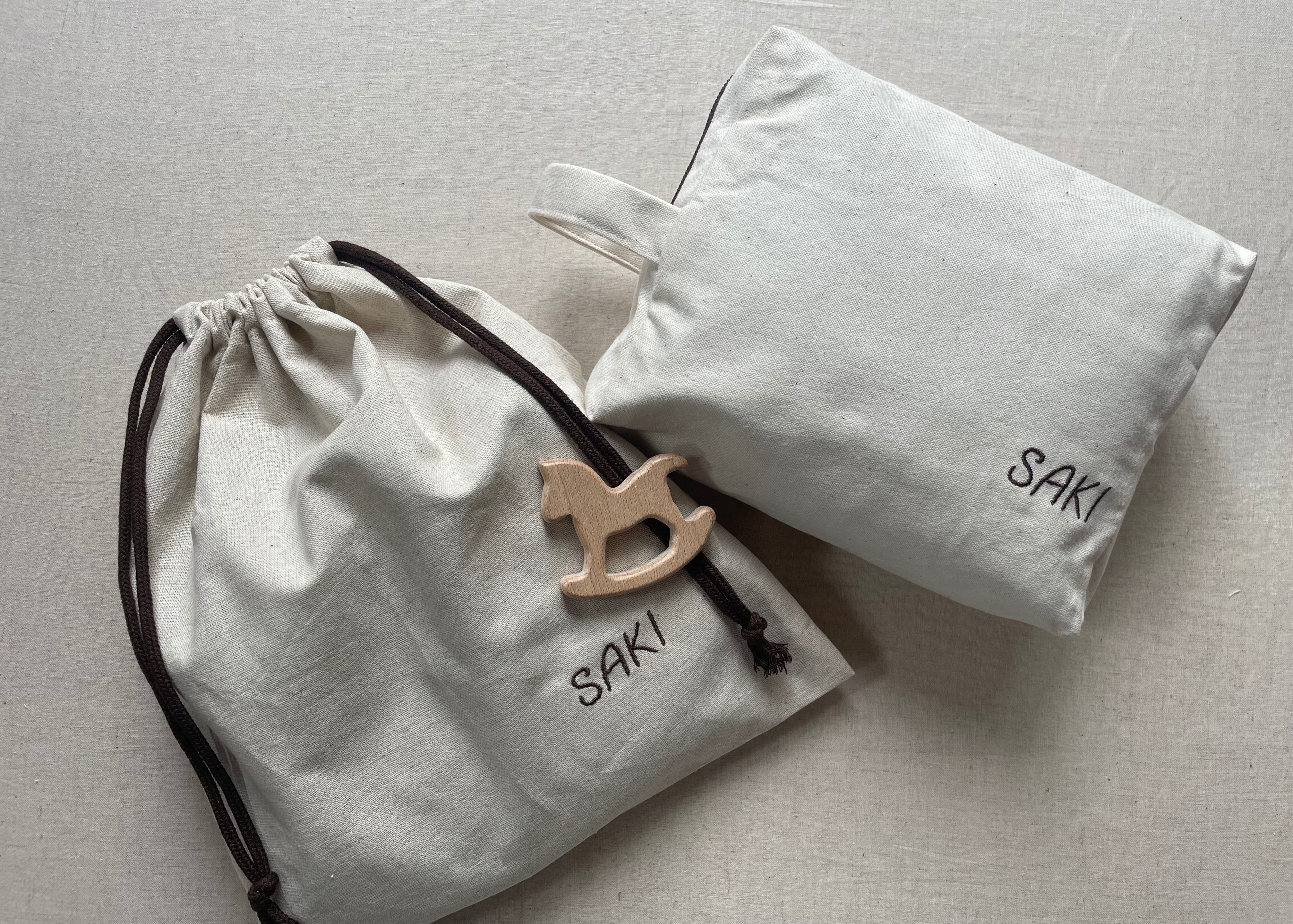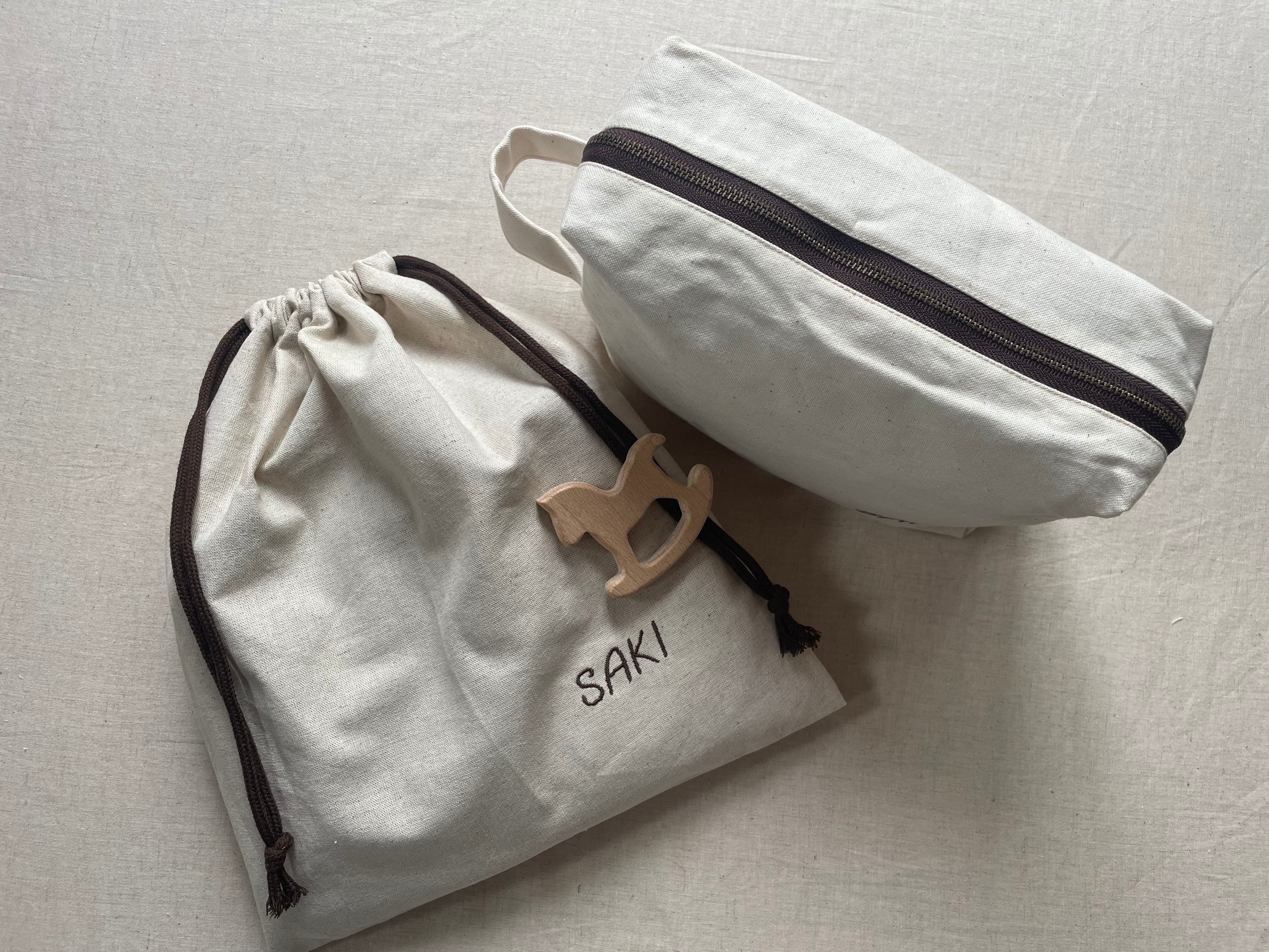 オムツポーチ・巾着袋・木製歯固め 3点セット きなり×チェック柄ブラウン 出産祝い可