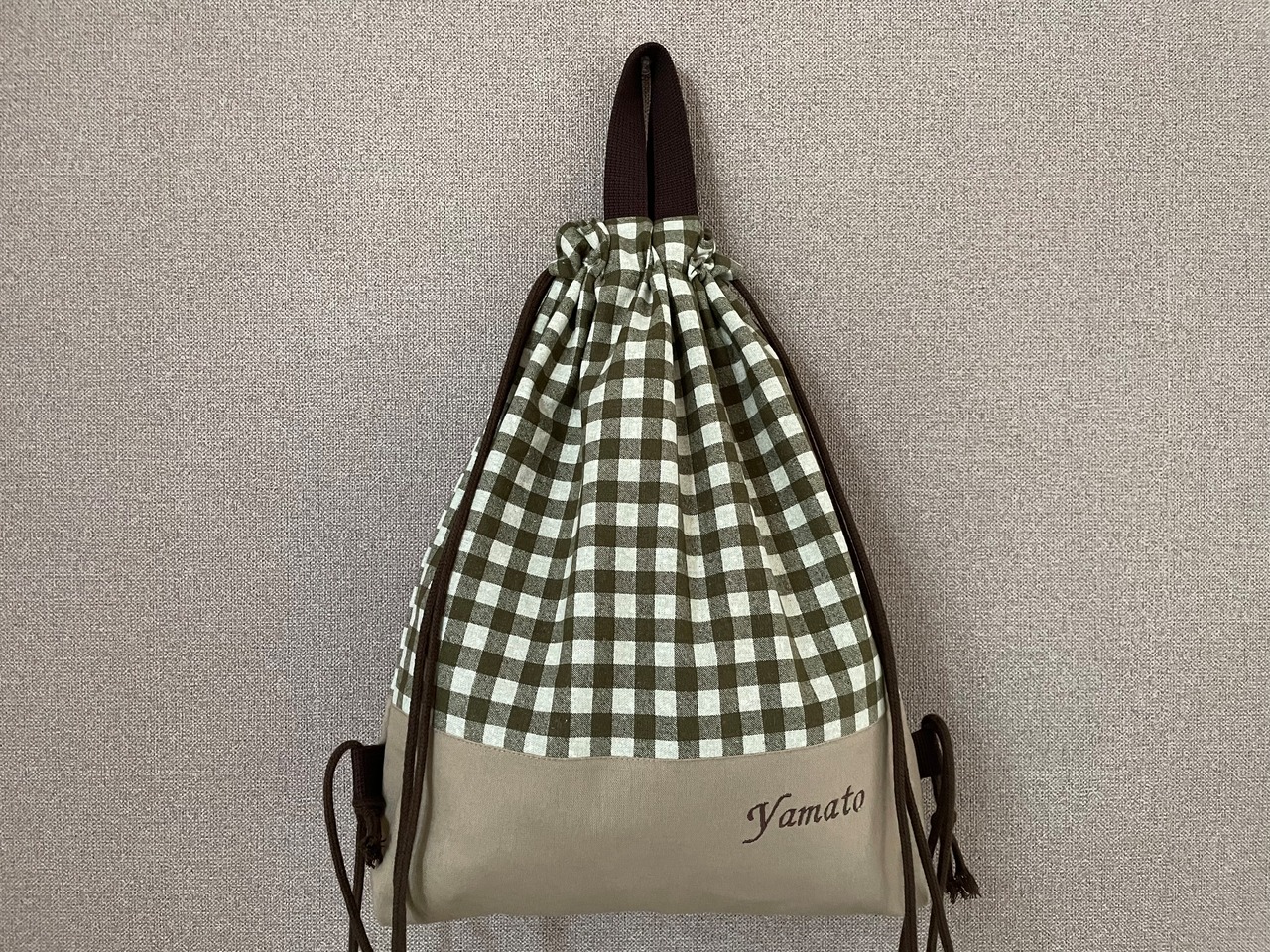 入園入学グッズ 体操服袋 綿麻キャンバス生地チェック柄グリーン×ベージュ