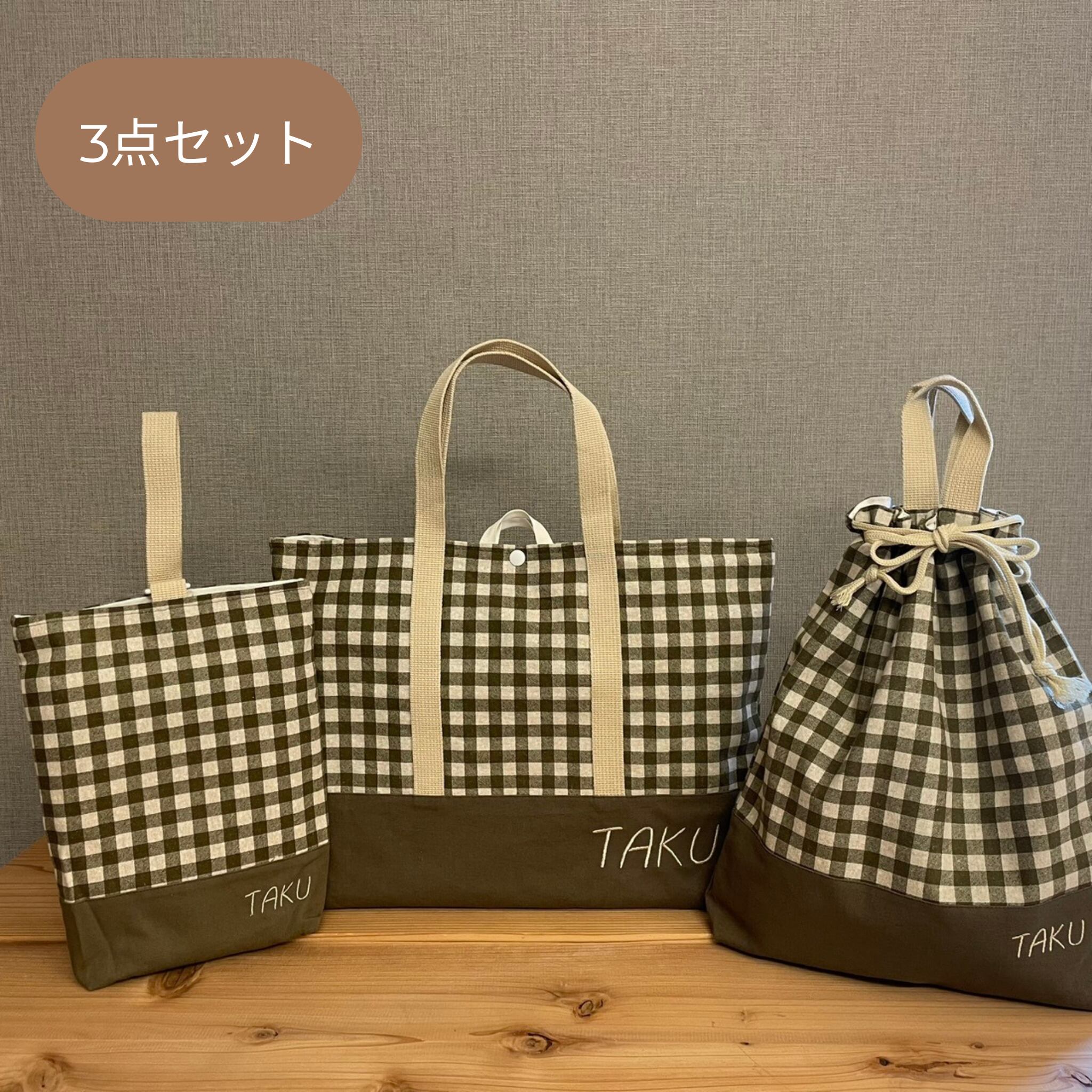 入園入学グッズ 3点セット 手提げ袋・体操服袋・上履き袋 綿麻生地チェック柄グリーン×カーキ