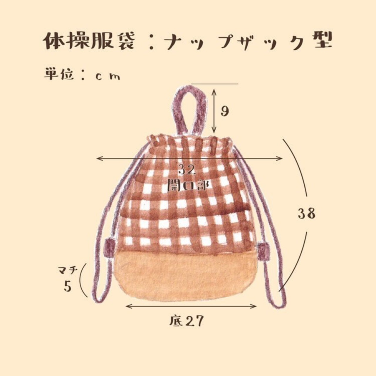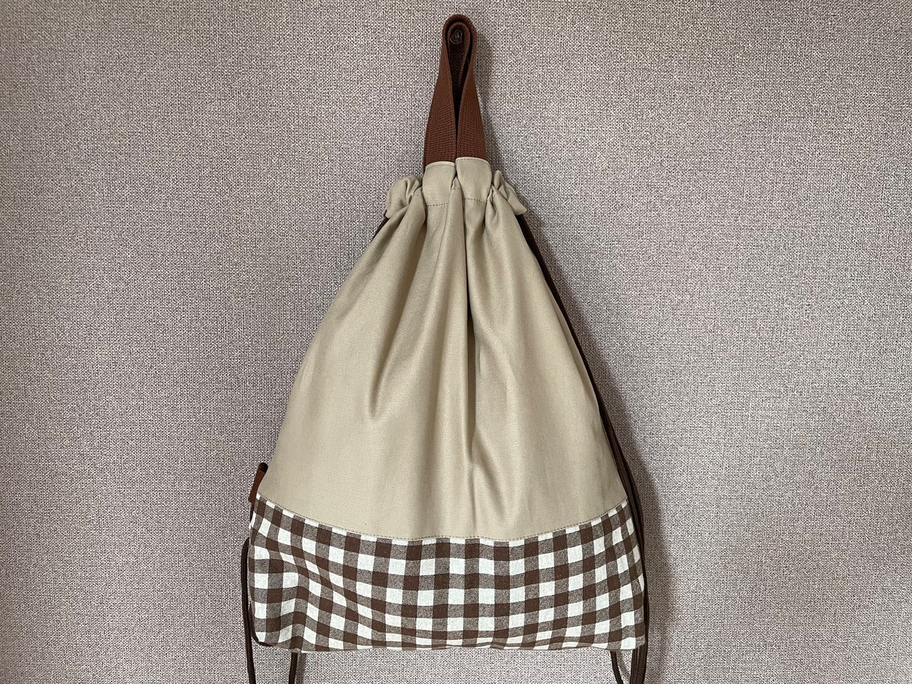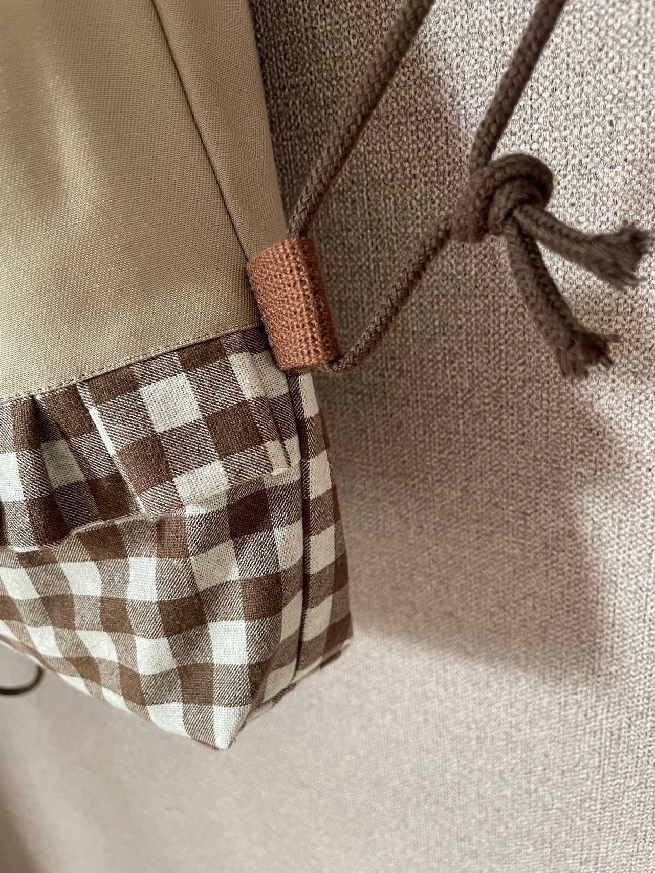 入園入学グッズ 体操服袋 綿生地ベージュ×綿麻生地チェック柄ブラウン フリルレース