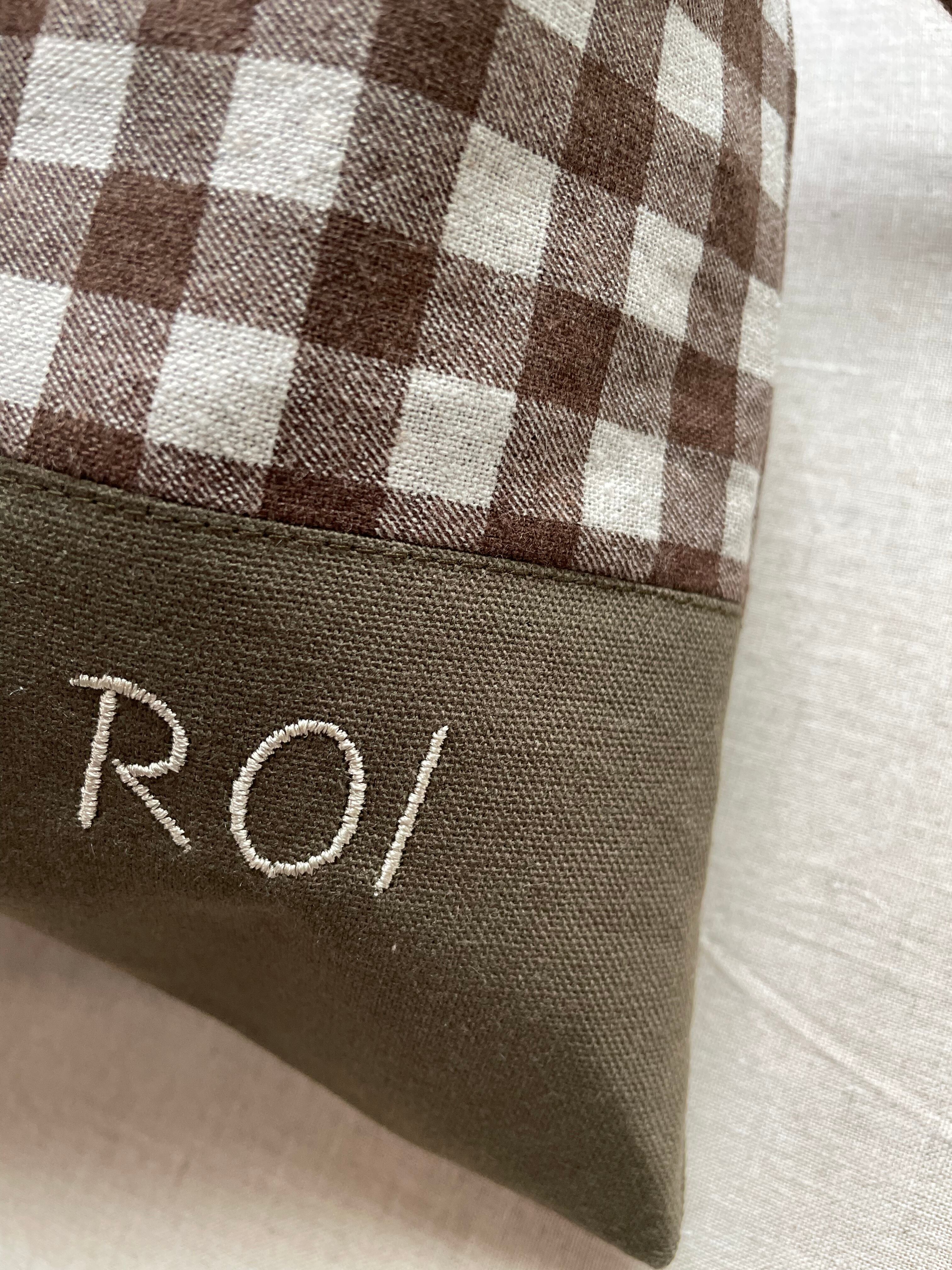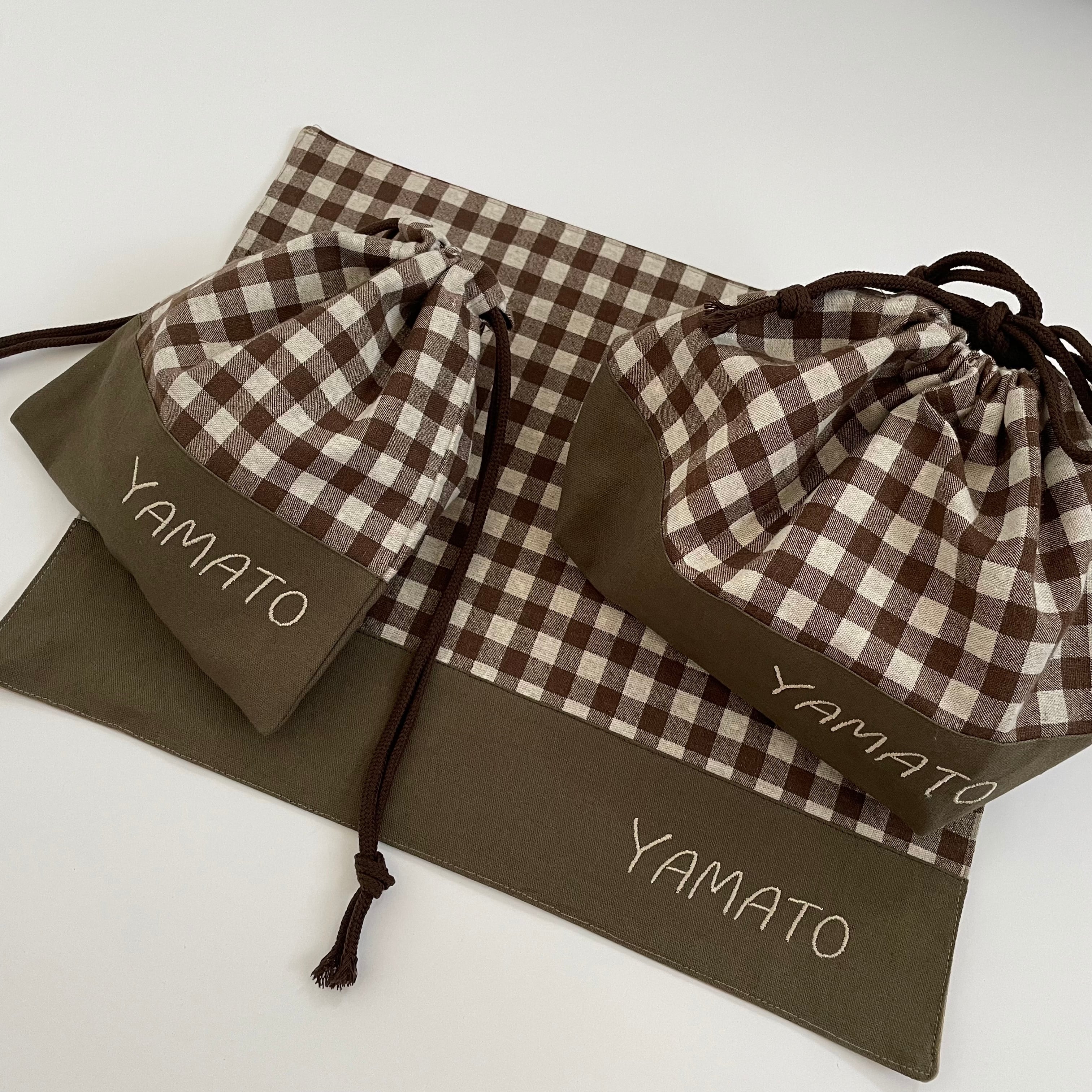 巾着袋・お弁当袋・ランチョンマット3点セット 綿麻キャンバス生地チェック柄ブラウン×カーキ