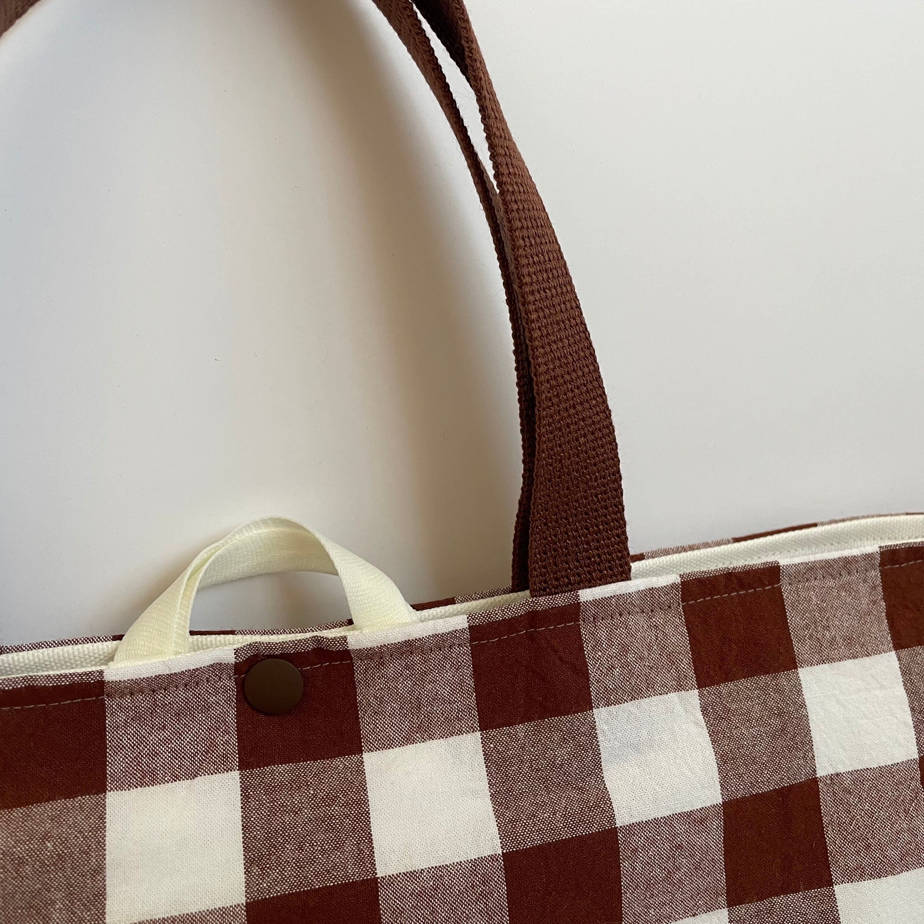 入園入学グッズ 手提げ袋 綿生地チェック柄ブラウン×綿麻キャンバス生地きなり