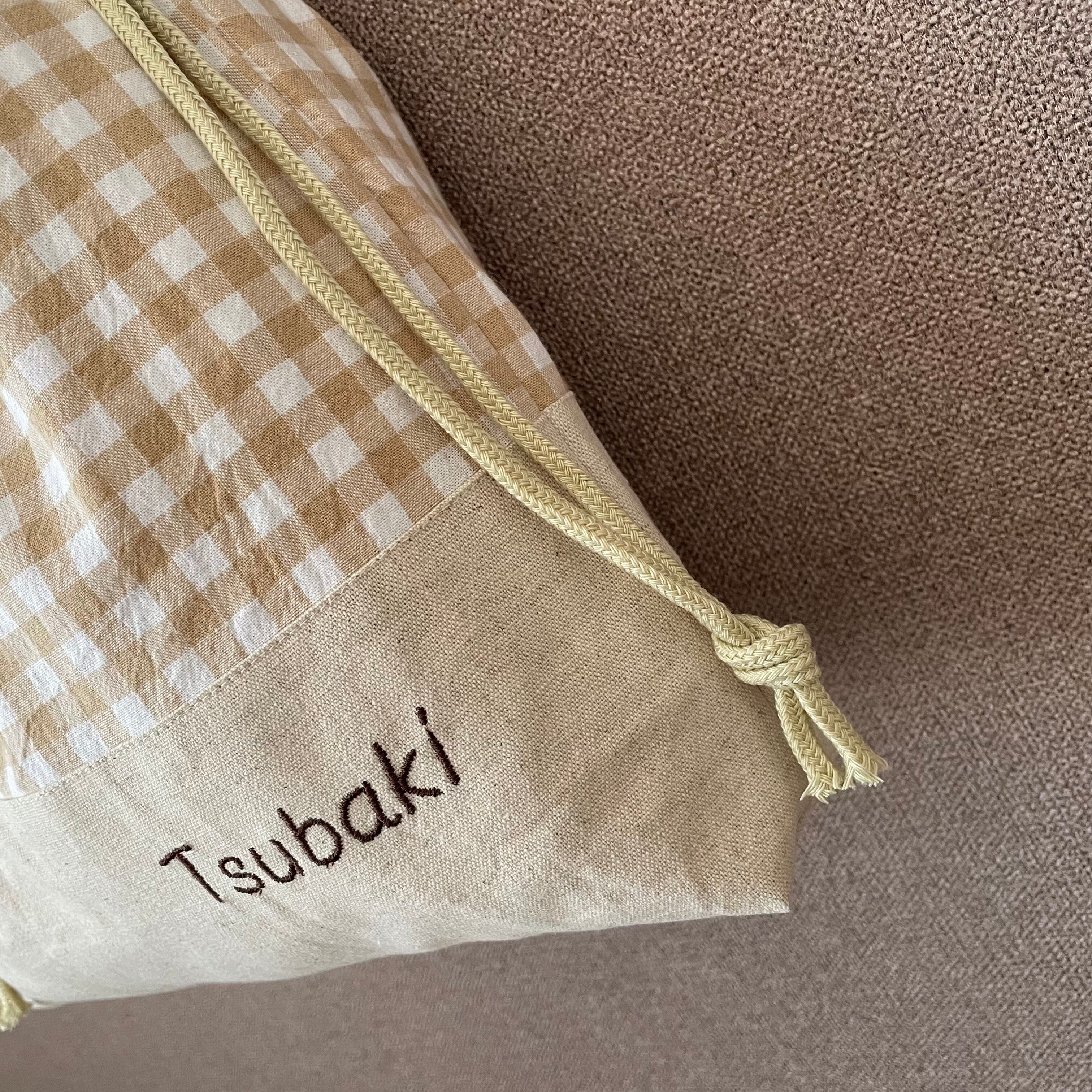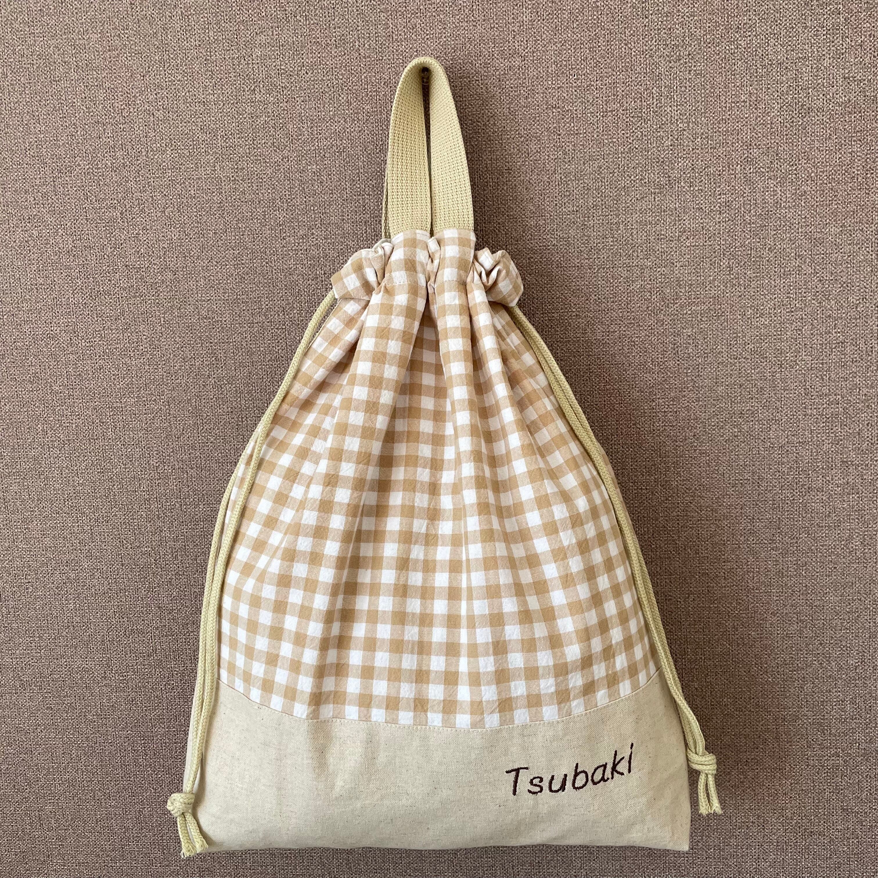 入園入学グッズ 体操服袋 綿生地チェック柄ベージュ×綿麻キャンバス生地きなり