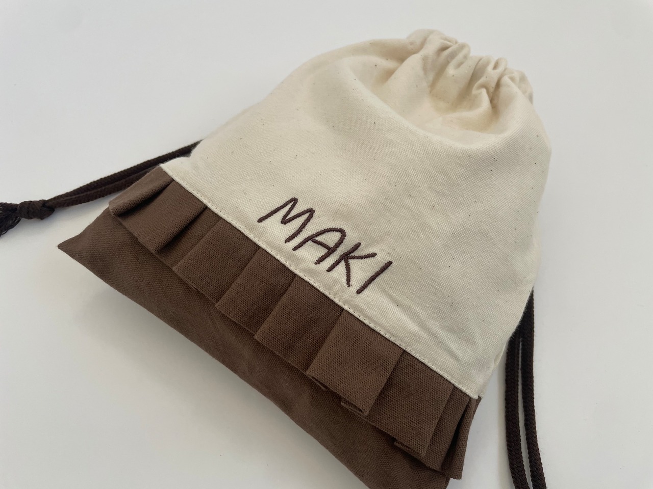 巾着袋・お弁当袋 2点セット 綿生地きなり×綿麻キャンバス生地ブラウン フリルレース